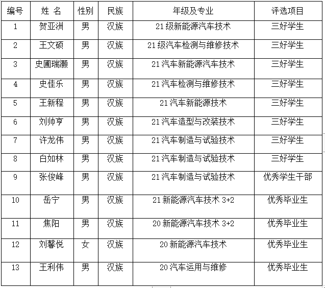 根据《关于开展自治区级高校“三好学生”“优秀学生干部”“优秀毕业生” 和“优秀班集体”评选活动的通知》要求,通过班级推荐、评议小组评选、系部党政联席会议决定,决定推荐以下同学: