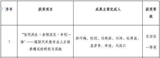 近日,内蒙古教育厅发布了《关于公布内蒙古自治区职业教育教学成果获奖名单的通知》(内教职称函[2022]27号),我系教学成果“协同共生•全程交互•专创一体---高职汽车类专业人才培养模式的研究与实践”喜获一等奖。该团队是一支学历结构、职称结构、双师结构、年龄结构合理的教科研创新队伍,团队负责人郝巧梅主任教科研经验丰富,业绩显著。该团队紧盯产业链条、紧盯企业需求,深化产教融合,积极搭建产教融合创新平台,多样化推进人才培养模式改革,大力推进教育教学改革创新,注重教学成果培育凝炼,获奖成果突显了我系近年来在校企合作、协同育人方面特色与成效。