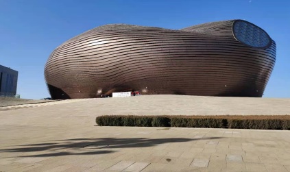 博物馆的造型非常独特,它是由著名设计师马岩松设计,它的设计理念来源于两个方面:第一,是来源于鄂尔多斯独特的地理地貌—砒砂岩,砒砂岩是以红色为主体的沉积岩,它象征着鄂尔多斯悠久的历史和敦厚的文化底蕴;另外一个方面则是具有现代抽象艺术感的蒙古包,它寓意着鄂尔多斯古老沧桑又充满生机的草原文明;而古铜色的金属外表既诠释着以鄂尔多斯青铜器为代表的中国北方早期畜牧文明,也展现着鄂尔多斯勇往直前的创新精神!