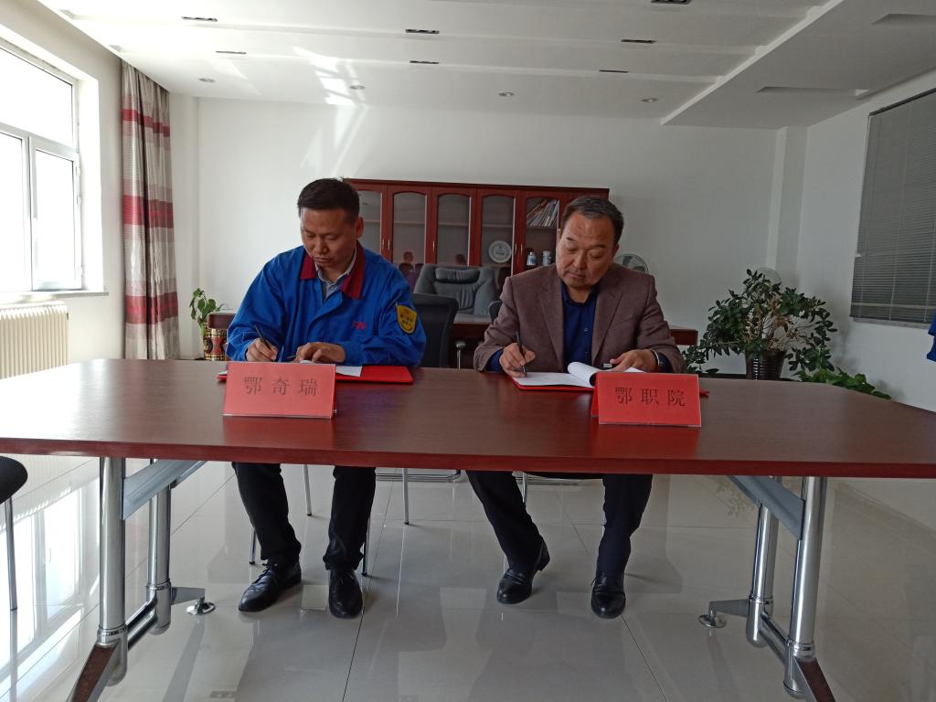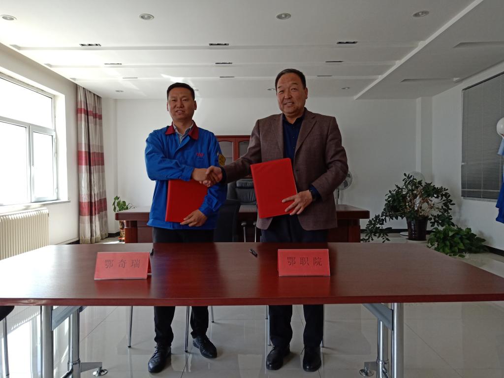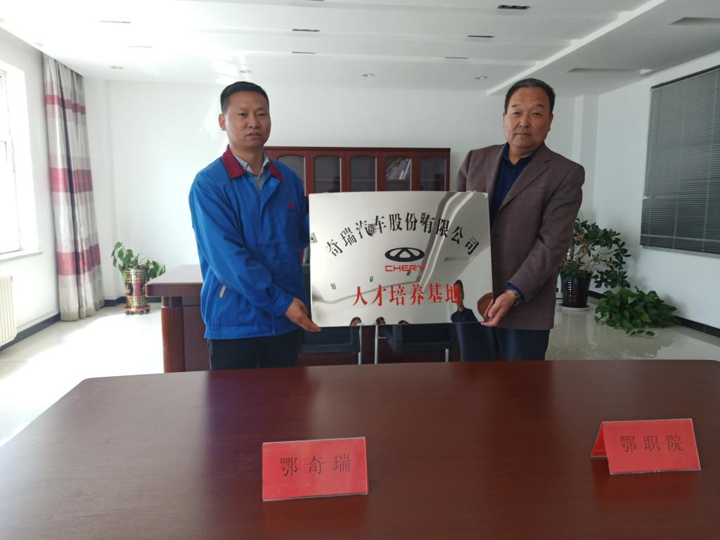 学院党委副书记、院长巴图查干与奇瑞汽车股份有限公司鄂尔多斯分公司行政人力总监任大美共同签订了“校企合作框架协议”和“奇瑞精英冠名班人才培养协议”。奇瑞人力总监任大美授与学院“奇瑞汽车股份有限公司人才培养基地”牌匾。副院长王贵、招生就业处、对外合作交流处处长孙虎、机械工程系主任郝巧梅、汽车技术教研室教师及企业人力资源部相关人员出席签约授牌仪式。