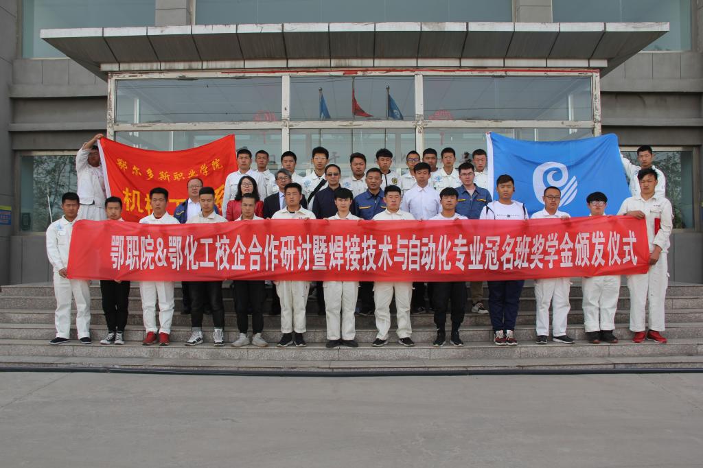 4月26日,“内蒙古鄂尔多斯电力冶金集团股份有限公司氯碱化工分公司与开云手机官方版在线入口校企合作研讨会暨焊接技术与自动化专业冠名班奖学金颁发仪式”在棋盘井经济开发区鄂尔多斯控股集团化工事业部隆重举行。学院副院长王贵、招生就业处及对外合作交流处处长孙虎、机械系主任郝巧梅、焊接专业教师王伟,化工事业部人力资源经理王志平、主管杨易之、校企合作主管黄拥军、招聘主管李亭参加研讨会。17、18级焊接专业学生参加了颁奖仪式及研讨会。