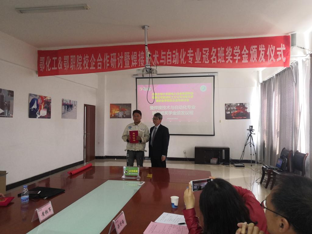 随后举行了“焊接技术与自动化专业冠名班奖学金颁发仪式”,17级焊接技术与自动化班呼立成、左锦涛、苗露分别获得一、二、三等奖学金。苗露代表获奖学员发言,感谢“订单合作”带来的机遇,让大家通过一周在化工事业部一周的实地参观体验,感受到企业的强大背景、人性化的管理模式和团队凝聚力,他表示选择鄂尔多斯化工事业部是就业的正确选择,是人生出彩的开始。