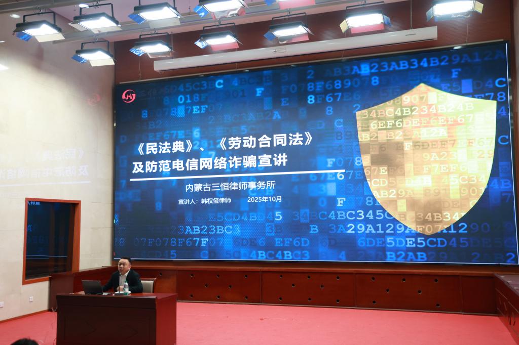 活动特邀内蒙古三恒律师事务所韩权玺律师,以“学法筑防线,守法护未来”为主题做法制教育专题讲座。韩律师围绕《民法典》《劳动合同法》及“防范电信网络诈骗”三大板块展开,结合自身丰富的执业经验,以案释法、以法论事,深入浅出地讲解了被誉为“社会生活的百科全书”的《民法典》的重要意义,并结合大学生未来就业中可能遇到的劳动合同签订、权利义务保障等问题,详细解读了《劳动合同法》的核心条款与注意事项;通过真实案例揭示了刷单返利、杀猪盘、冒充客服退款、冒充公检法等常见诈骗手段,强调了个人信息保护与理性理财的重要性,现场传授了识别与应对诈骗的实用技巧,提醒同学们“不轻信、不转账、不泄露”,切实守护好个人财产与信息安全。