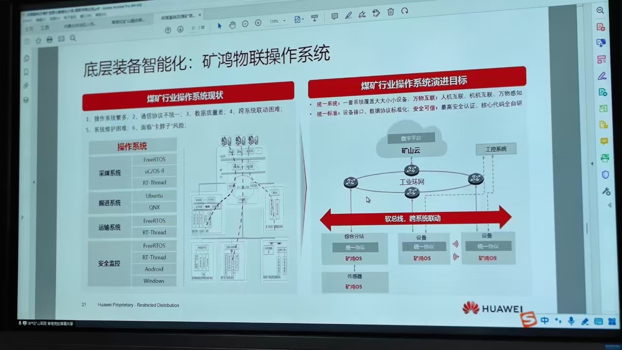 华为专家首先阐述了煤炭开采的基础概念,详细解读了不同煤炭类型的特点及其在开采过程中的技术要点。随后,专家对煤矿信息化建设的发展历程、建设内容进行了详细介绍,并分析了当前存在数据烟囱、数据接口标准等的问题。针对这些问题,专家分享了华为煤矿智能化建设方面的创新,并针对底层矿鸿系统、5G工业网、煤矿算力平台、工业大模型、车路云等系统进行了进一步的讲解。