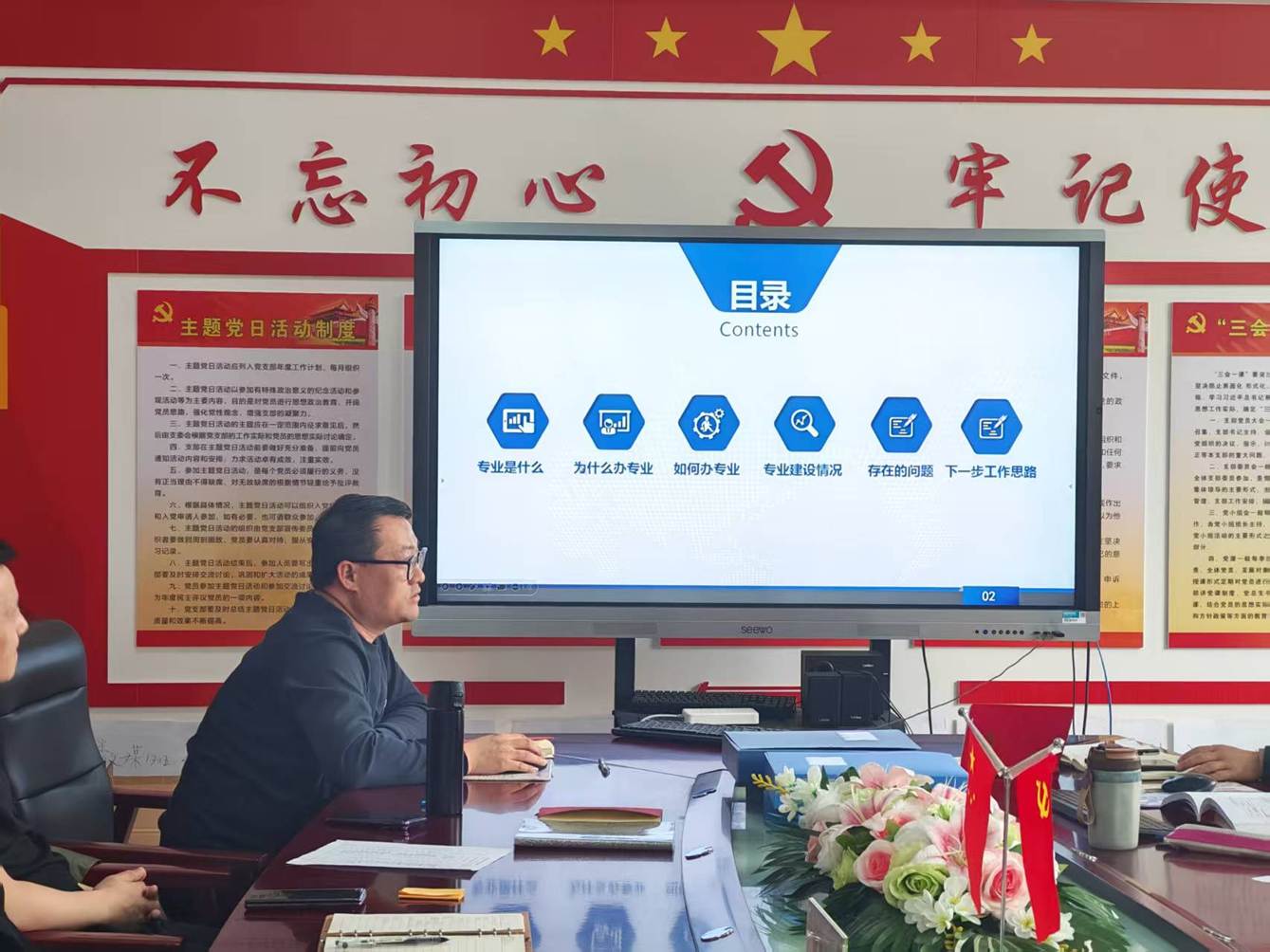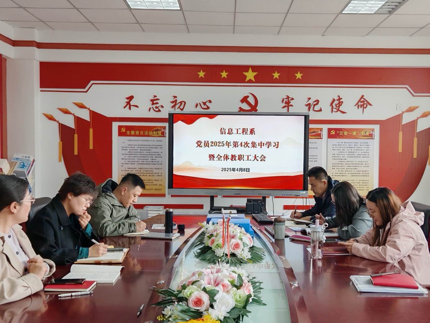 2025年4月8日信息工程系党总支召开第四次党员集中学习暨教职工大会,会议由武小芳主任主持,党总支副书记李莉杰及全体教职工参加。
