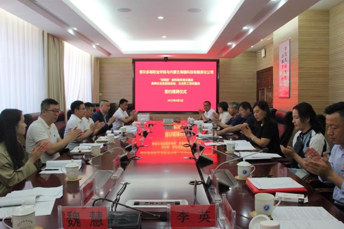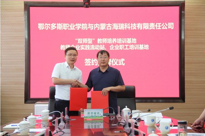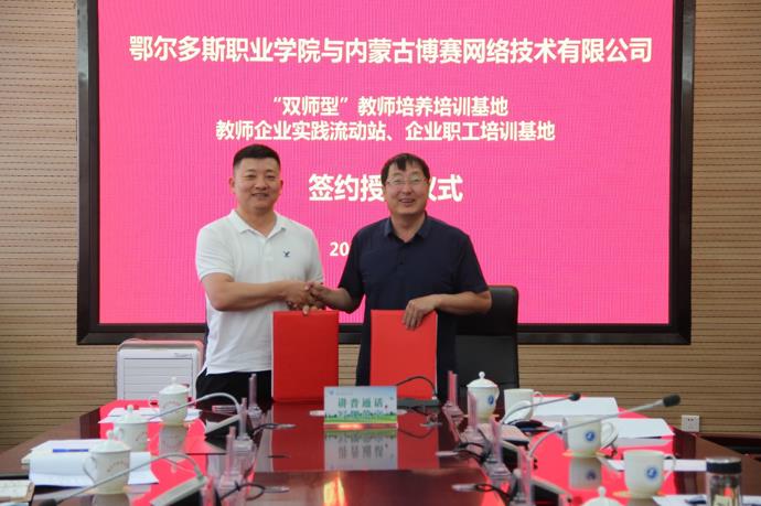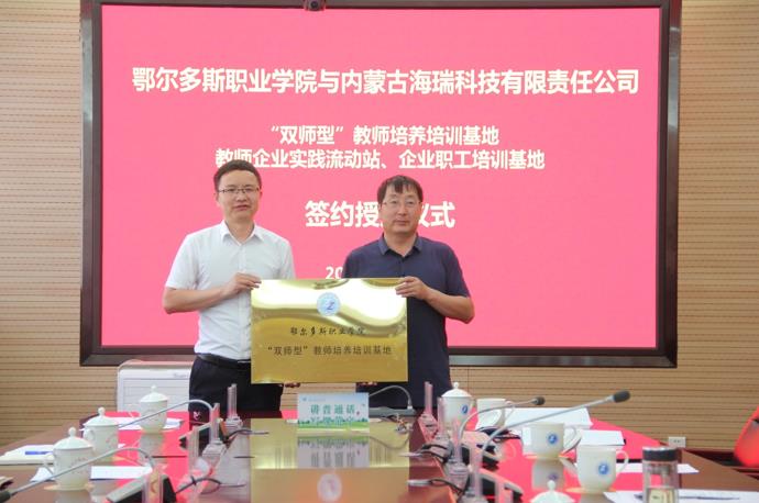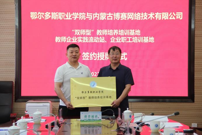 会上校企双方签订了《开云手机官方版在线入口“双师型”教师培养培训基地和教师企业实践基地框架协议》和《开云手机官方版在线入口教师企业实践流动站框架协议》,杭刚代表学院分别授予两家企业“开云手机官方版在线入口‘双师型’教师培养培训基地”、“开云手机官方版在线入口教师企业实践流动站”牌匾。两家企业分别授予开云手机官方版在线入口“内蒙古博赛网络技术有限公司职工培训基地”牌匾和“内蒙古海瑞科技有限责任公司职工培训基地”牌匾。