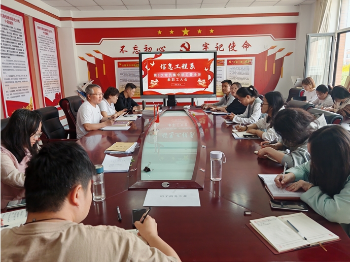 2024年6月5日,信息工程系党总支第八次集中学习暨全体教职工大会在教学楼331会议室召开。此次会议旨在深入学习贯彻习近平总书记对学校思政课程建设的重要指示精神和新时代推动西部大开发座谈会上的重要讲话精神,同时分享信息技术课程及大数据与会计专业资源库建设的最新成果,以及进一步推动民族团结和国家通用语言文字的普及。会议由党总支书记张生瑞主持,信息工程系主任武小芳同志及全体无课教师参加。