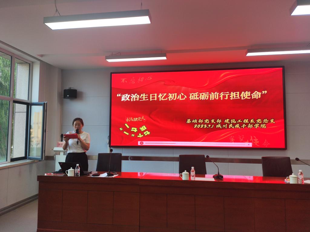 为隆重庆祝中国共产党成立102周年,充分发挥党组织政治引领作用,7月1日晚,基础部党支部和建筑工程系党总支在内蒙古城川干部学院开展“政治生日忆初心 砥砺前行担使命”--七个“一”庆七一活动,旨在营造爱党爱国爱社会主义的浓厚氛围,增强党组织创造力、凝聚力、战斗力。