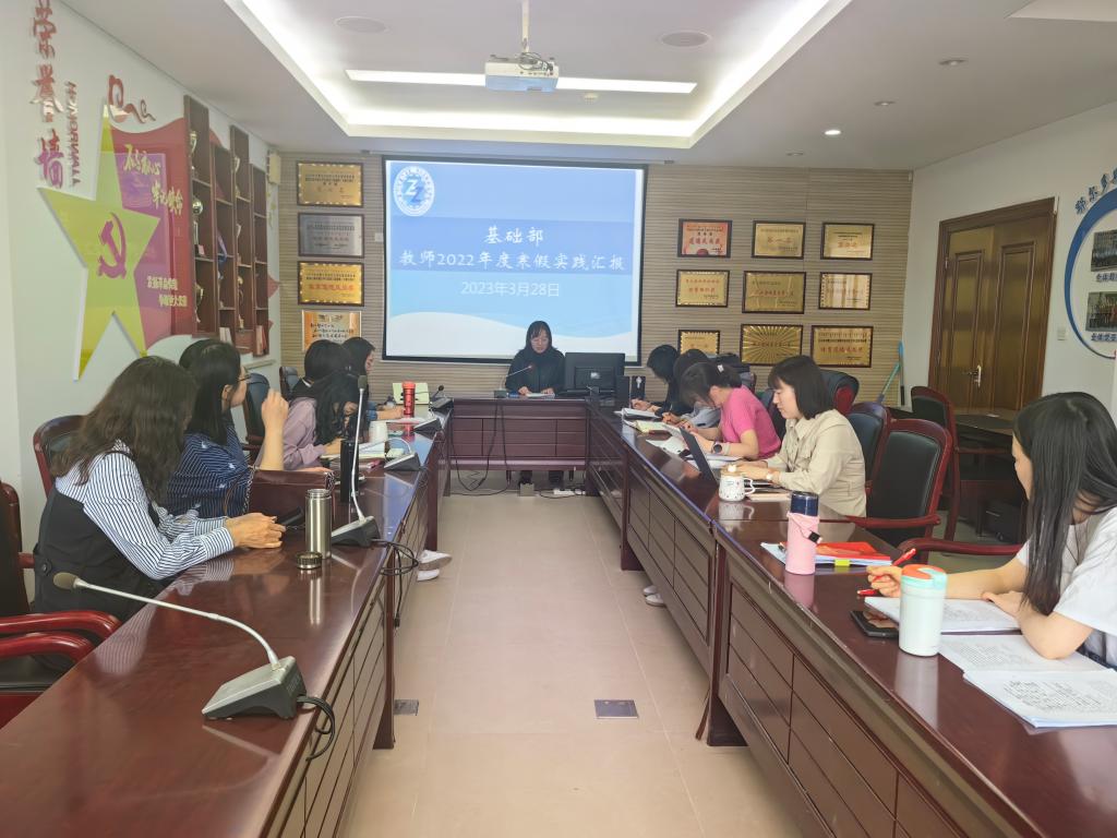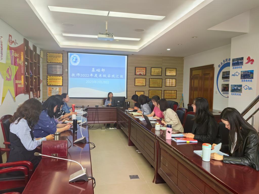 为深入贯彻落实学院人才强校战略,提高教师的教学、科研能力,建设一支高素质的教师队伍。基础部2位教师利用寒假休息时间赴企事业单位进行为期一个月实践锻炼,并且与各自所在的实践岗位负责人进行了深入交流。2023年3月28日下午14:30基础部组织寒假实践教师在401会议室进行实践汇报。基础部英语教研室主任王雅琴主持会议,教师发展中心科长李波参加此次汇报会。
