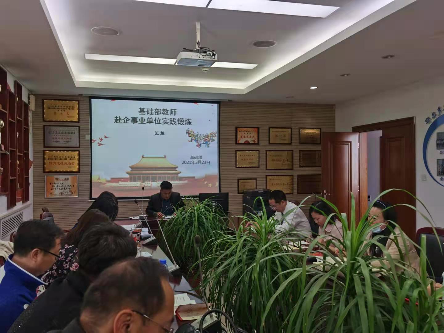 为深入贯彻落实学院人才强校战略,加强专业梯队建设,提高教师的教学、科研能力,建设一支高素质的教师队伍。2021年3月23日下午,基础部组织全体教师听取了基础部7名教师为期一个月赴企事业单位暑期实践锻炼成果汇报,并且进行了交流。基础部负责人胡喜和主持了会议。