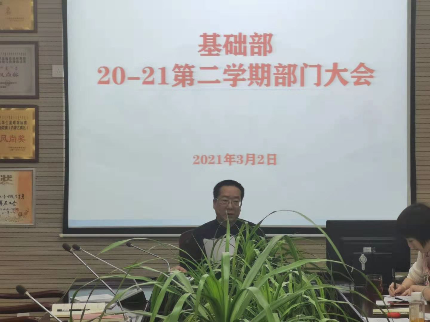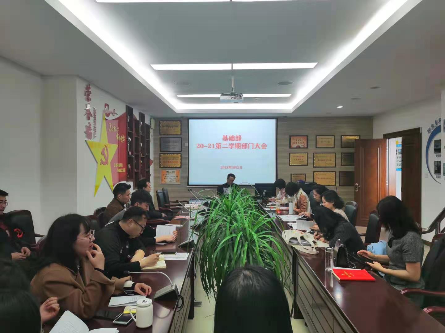 为了全面推进新学期各项工作,2021年3月2日,基础部在401会议室召开部门大会,会议由基础部副主任胡喜和主持,基础部全体教职工参加了会议。