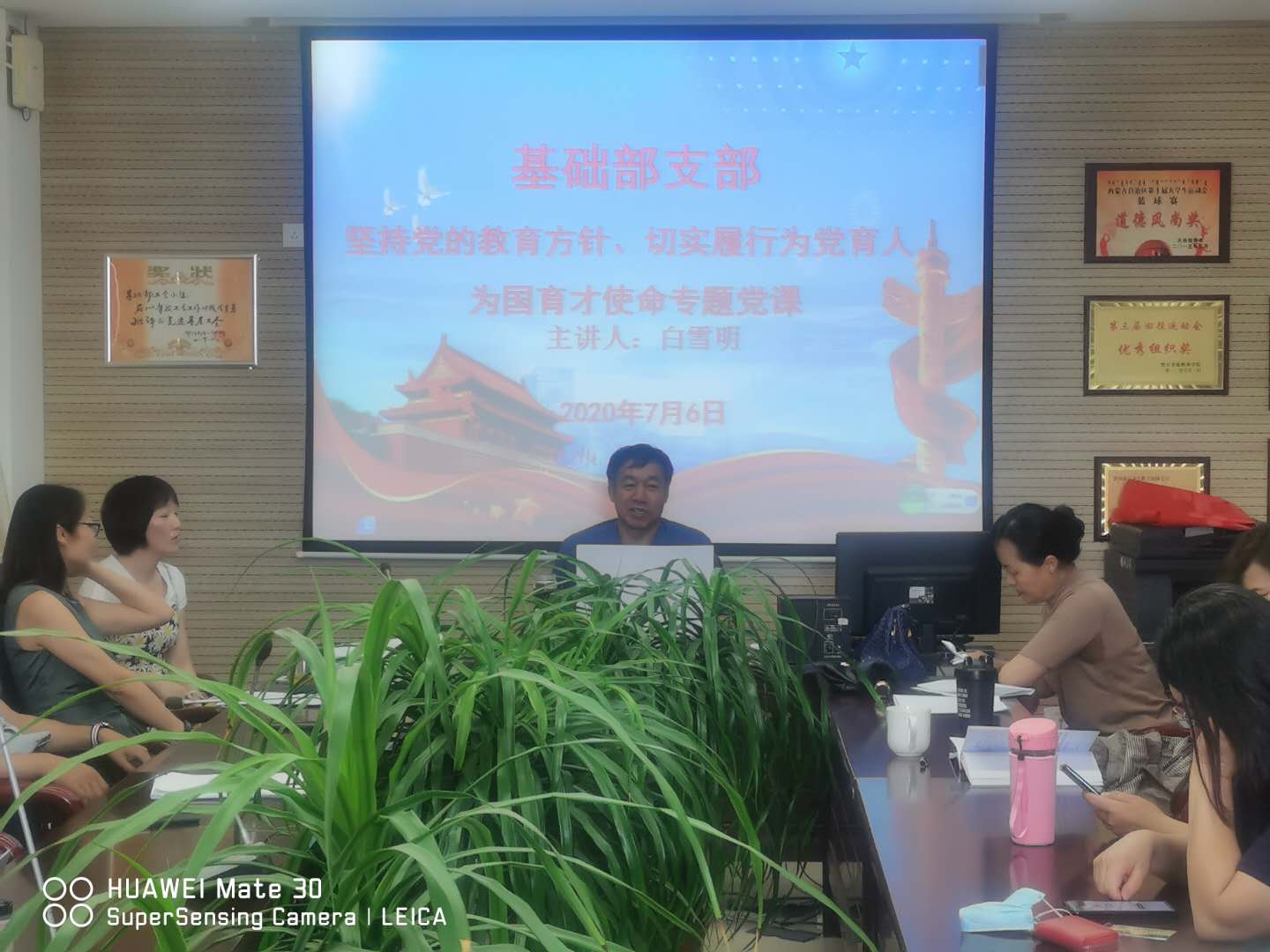 为全面贯彻党的教育方针,落实立德树人根本任务,继续扎实推进“不忘初心、牢记使命”主题教育往深里走。7月6日下午,基础部支部书记白雪明在教研楼401会议室为基础部全体党员、教师做题为“坚持党的教育方针、切实履行为党育人、为国育才专题教育党课”。