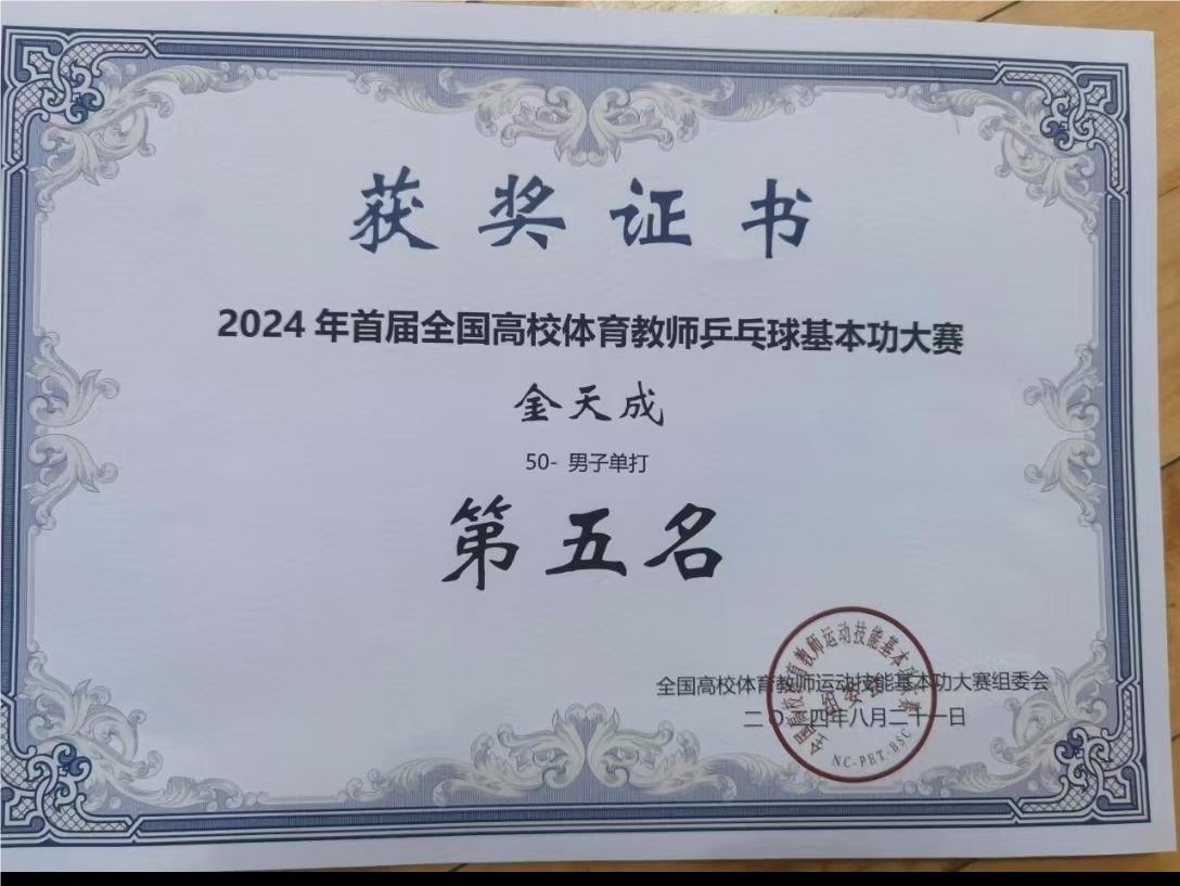 在2024年首届全国高校体育教师乒乓球基本功大赛中,基础部老师金天成荣获基本功三等奖,实战比赛单打第五名!祝贺金天成老师!