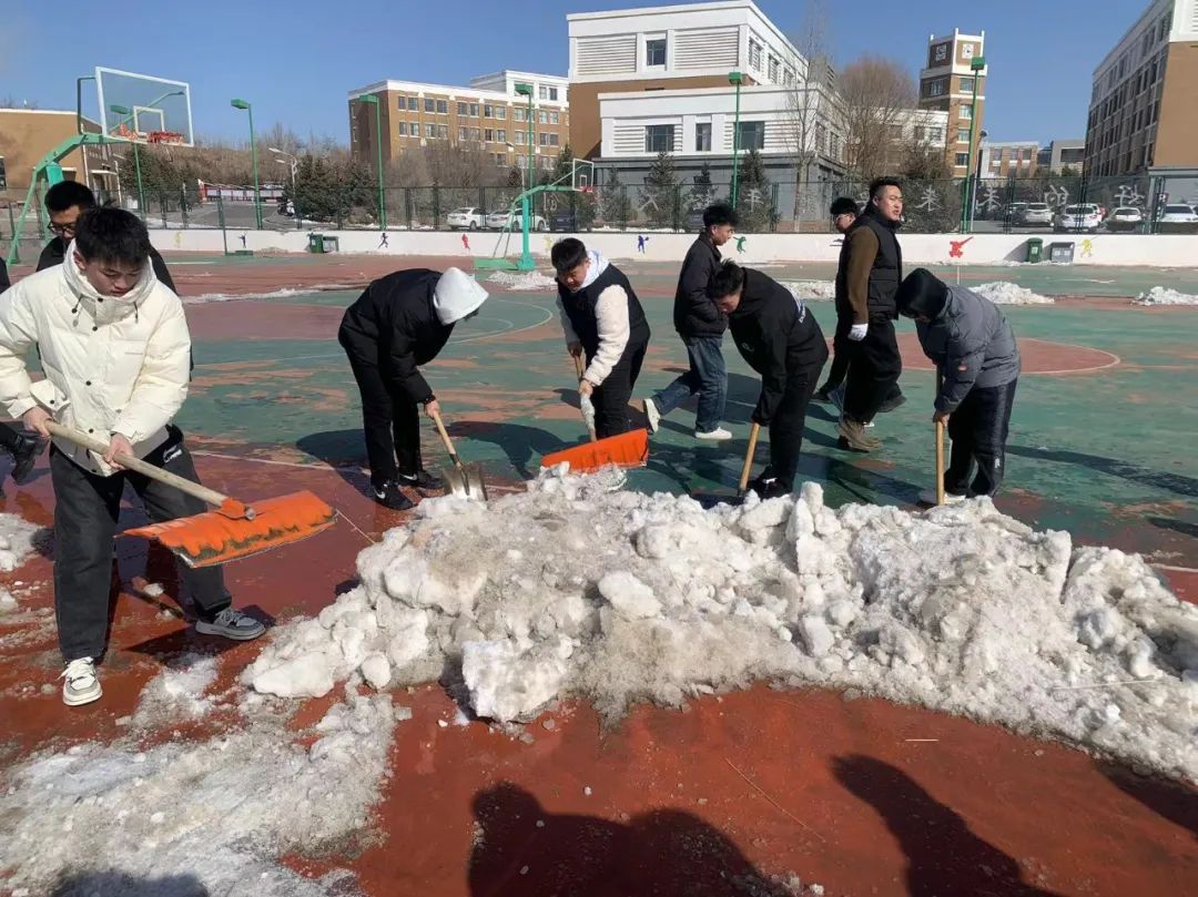 大家以雪为令,迅速迎战,在零下十多度的天气里挥舞着手中的铁锹、扫帚等扫雪工具,铲的铲、推的推、扫的扫,分工明确,配合默契,在相互配合中作业,师生们干得不亦乐乎,忙碌的身影给初春的校园带来了欢声笑语,在冰雪中同上一堂劳动教育课。
