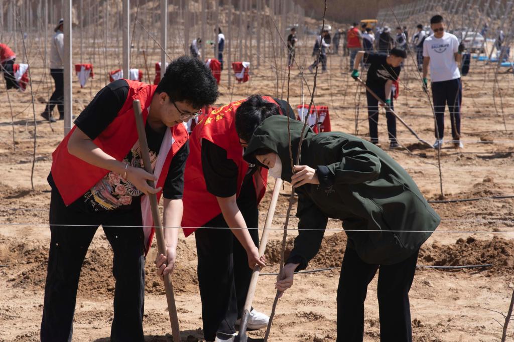 在植树现场,宋希文与师生一起挥锹铲土、扶树填坑,合力栽下一棵棵小苹果树。整个劳动场面繁忙而有序,新栽种的小树迎风挺立,展现出勃勃生机。看着自己亲手种下的小树,为矿区增添一抹绿色,大家心里特别高兴。