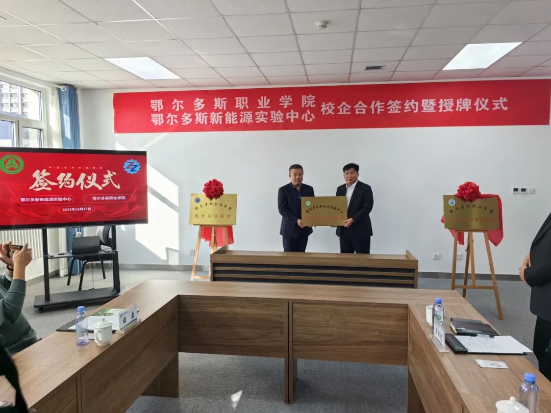 任光飞与魏渊代表双方签订校企合作框架协议同时为“开云手机官方版在线入口校外实训基地”“教师企业实践基地”揭牌,张建林、张鹏为“鄂尔多斯新能源实验中心企业员工培训基地”揭牌。