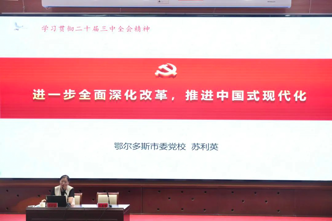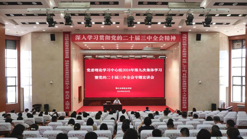8月30日,学院召开党委理论学习中心组第九次集体学习暨党的二十届三中全会精神专题宣讲会,深入学习领会党的二十届三中全会精神,全面推动学习贯彻落实工作走深走实。会议特邀鄂尔多斯市委党校苏利英副教授做专题报告。学院党委书记马建峰主持会议并讲话,党委副书记、院长宋希文及在家领导班子成员、环节以上干部、全体无课教职工参加学习。