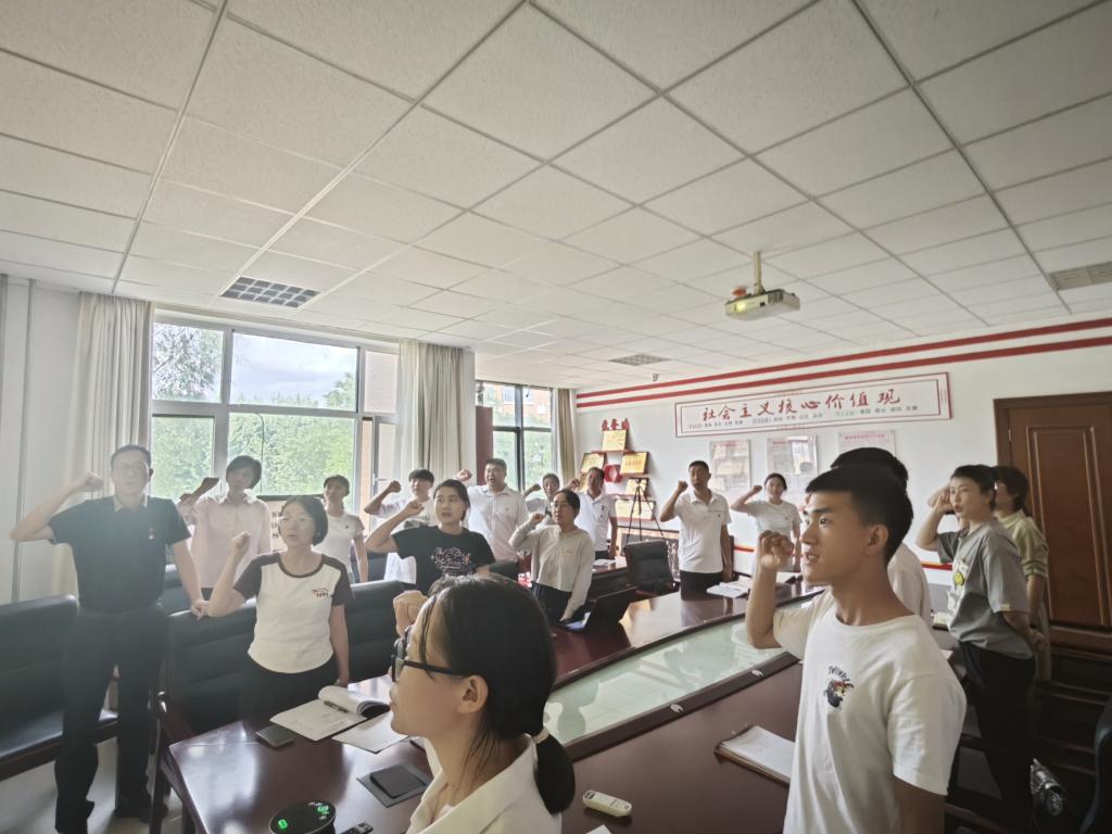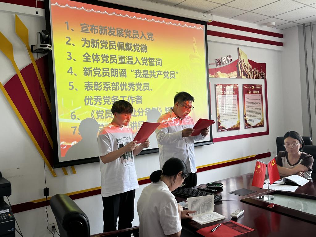 此次党日活动主要有六项内容。首先宣布新发展党员入党,并为这些新党员举行了佩戴党徽的仪式,象征着他们正式成为了中国共产党的一员。接着,所有党员一起重温了入党誓词,新党员也朗诵了“我是共产党员”,表达出他们对党的忠诚和对人民的承诺。