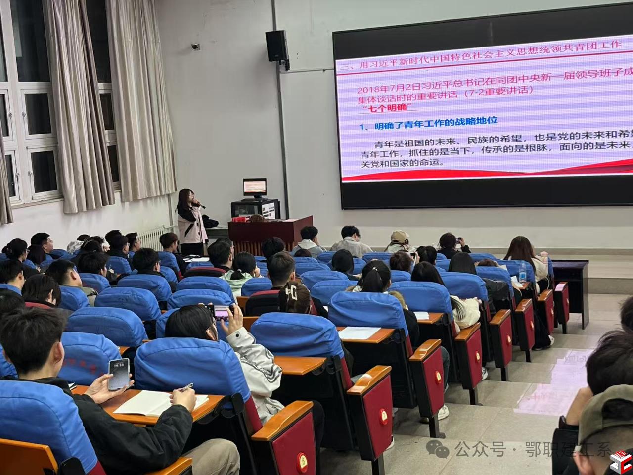 为加强青年思想引领,切实做好新团员发展工作,加强共青团组织建设,提升入团积极分子思想觉悟和政治素养,2025年3月20日晚,建筑工程系团总支在223阶梯教室开展了《唱响新时代青春之歌》第一次入团积极分子团课。本次团课由信息工程系团总支负责人郭美园老师进行讲解。