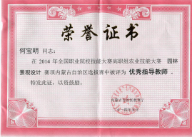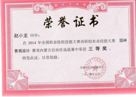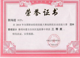 2014年全国职业院校技能大赛高职组农业技能大赛园林景观设计赛项内蒙古自治区选拔赛中荣获三等奖。