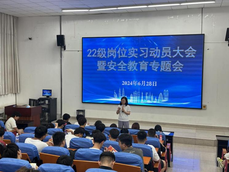为加强学生管理,确保2022级学生岗位实习工作稳步推进,6月28日,化学工程系在教学楼阶梯教室223召开22级岗位实习动员大会暨安全教育专题会议,化学工程系党总支书记、主任马桂香,副主任钱春苹,学工科科长张乾及22级全体学生参加了会议。