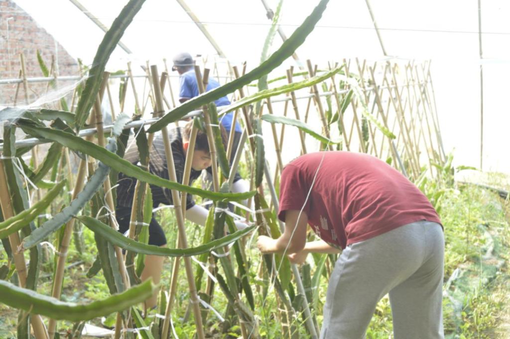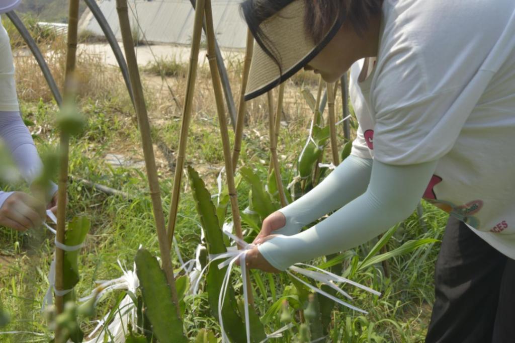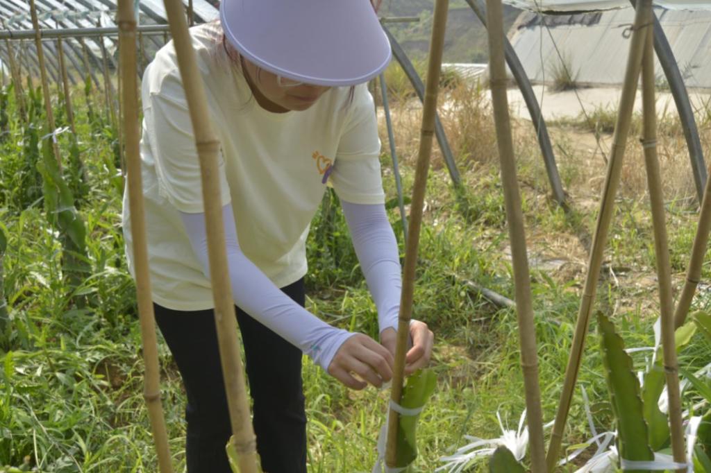 随后,队员们积极投身农田工作,亲自动手为火龙果绑枝条。这次农田实践操作不仅增加了队员们的社会责任感和使命感,还进一步激发了他们对实施乡村振兴战略的支持,鼓舞他们为实现乡村振兴贡献自己的力量。