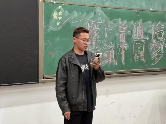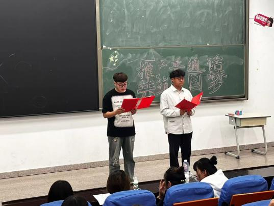 2024年9月16日至9月22日是第27届全国推广普通话宣传周。为弘扬中国优秀传统文化,帮助广大青年树立规范使用语言文字的意识,营造文明规范的校园语言氛围,9月22日,化学工程系在阶梯教室 222举办了“推广普通话 共筑中国梦 ”普通话比赛暨主题团日活动,23、24级部分学生参加了活动。