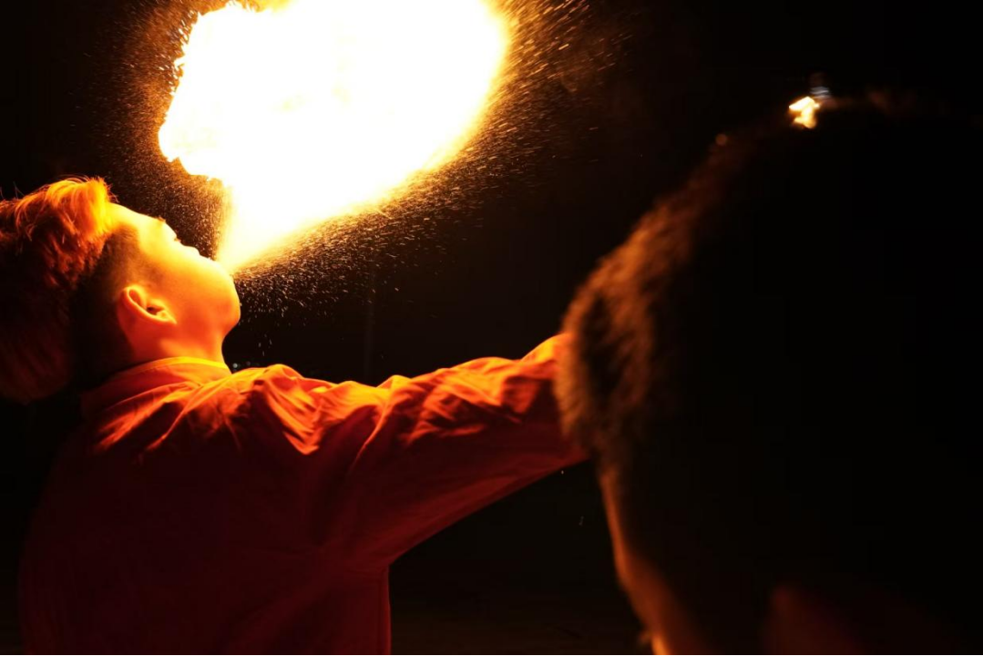 舞狮表演更是将现场气氛推向高潮,狮子时而腾空跃起,时而俯身翻滚,动作矫健灵动,神态惟妙惟肖,仿佛两只真雄狮在欢腾跳跃,赢得了观众们阵阵热烈的掌声。而喷火环节更是让现场观众惊叹不已,只见长长的火焰在夜空中划出一道道绚丽的弧线,瞬间点燃了跨年现场的热情,现场观众纷纷拿出手机记录下这精彩瞬间,欢呼声、掌声此起彼伏,经久不息。