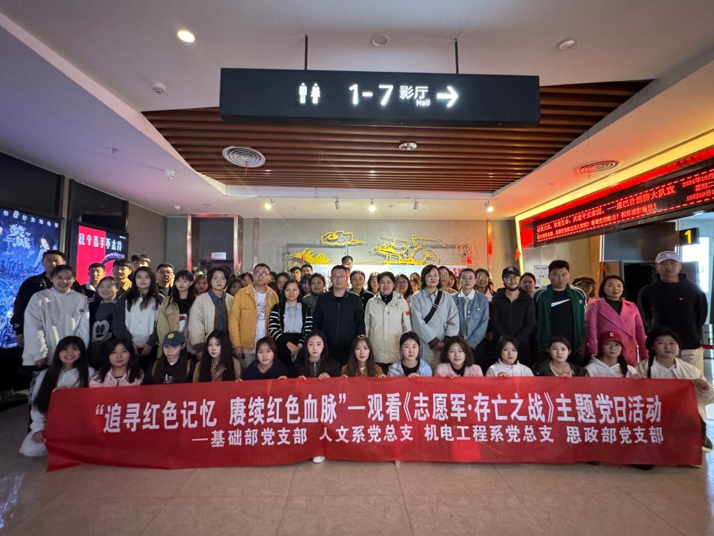 为传承红色基因,弘扬革命传统,让党总支成员更加直观地感受到革命先辈的英勇无畏和坚定信念,同时为进一步推动“感党恩、听党话、跟党走”群众教育实践活动走深走实,人文管理系党总支联合我院基础部党支部、机电工程系党总支、思政部党支部于2024年10月29日共同开展了“追寻红色记忆 赓续红色血脉”——观看《志愿军·存亡之战》主题党日活动,我系教工支部无课教师党员与学工支部预备党员、发展对象等成员参与此次活动。