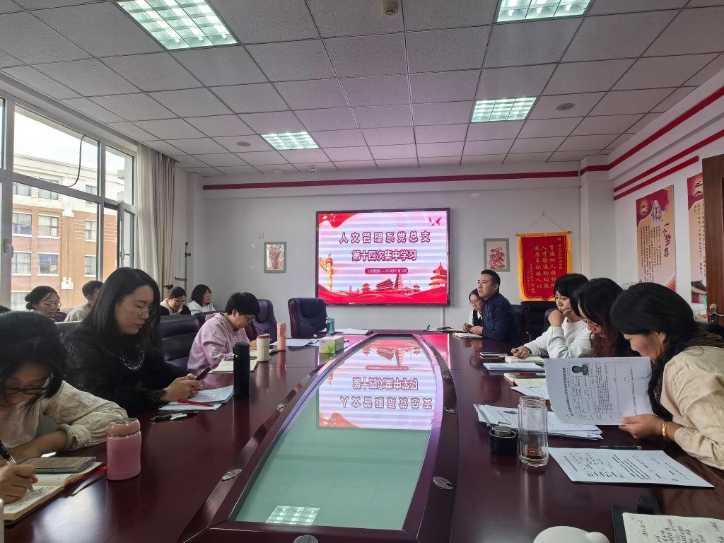 为持续深入学习贯彻党的二十届三中全会精神,全面落实党的教育方针,推动党的创新理论学习入脑入心,激励全体党员教师凝心聚力、奋发向上。11月12日,人文管理系党总支在教研楼431召开了第十四次集中学习会议。