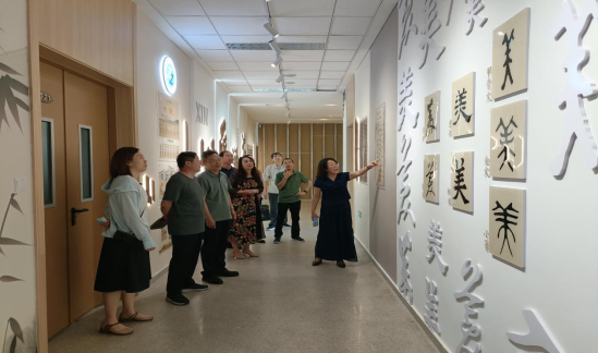 教务处处长郝巧梅从美育工作委员会、美育课程体系等多个方面介绍了美育基地的建设和美育教育工作的开展情况。宋院长一行先后参观了美育基地的各个功能室和文化展示墙,各功能室负责教师进行了相关介绍。