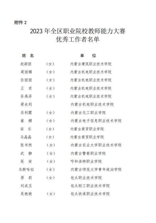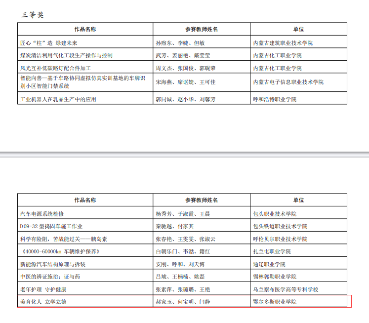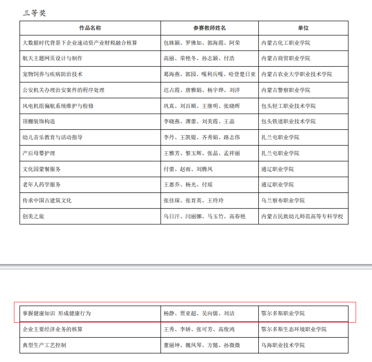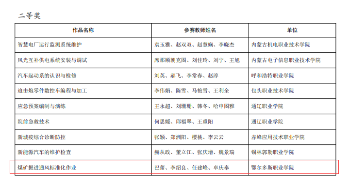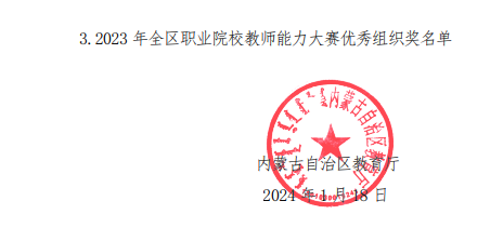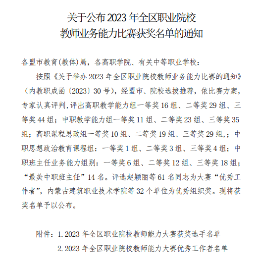 近日,自治区教育厅印发《关于公布2023年全区职业院校教师业务能力比赛获奖名单的通知》(内教职成函〔2024〕4号),我院在2023年全区职业院校教师业务能力比赛中荣获佳绩,共有5个团队、1名教师获奖,学院获评优秀组织奖。