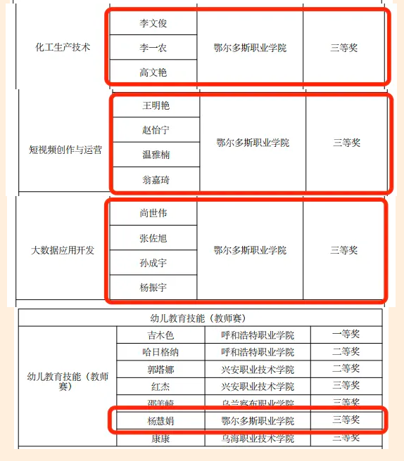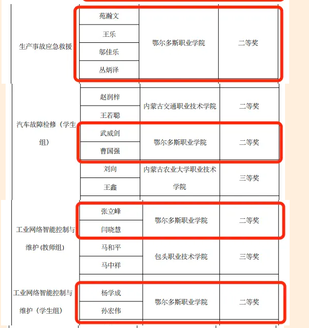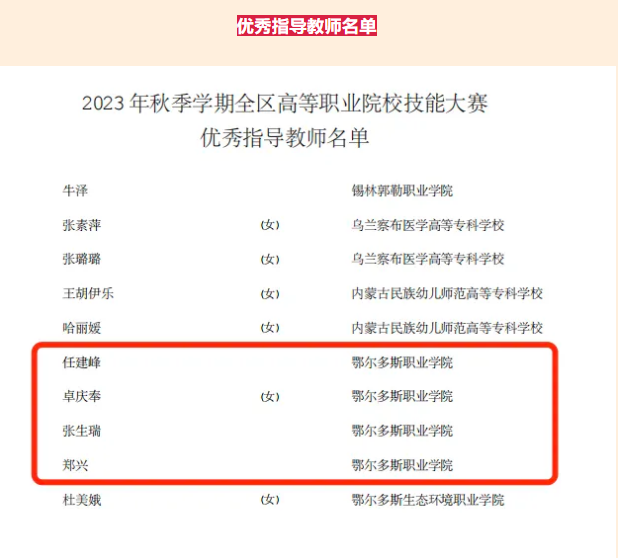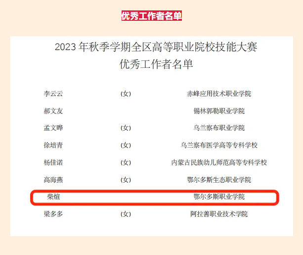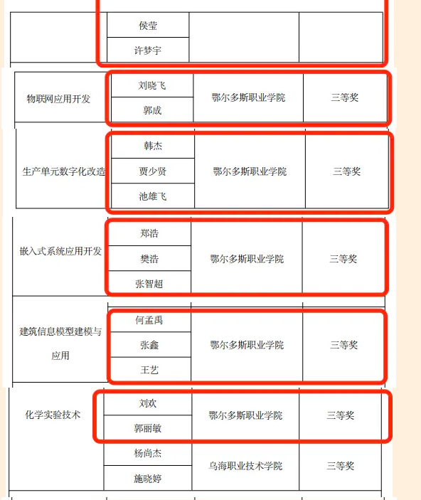 我院在2023 年秋季学期全区高等职业院校技能大赛中获得佳绩:一等奖3个、二等奖8个、三等奖12个、优秀指导教师4名、优秀工作者1名。推送4支队伍参加2024年国赛,一份耕耘一份收获,恭喜他们,预祝国赛再创佳绩!