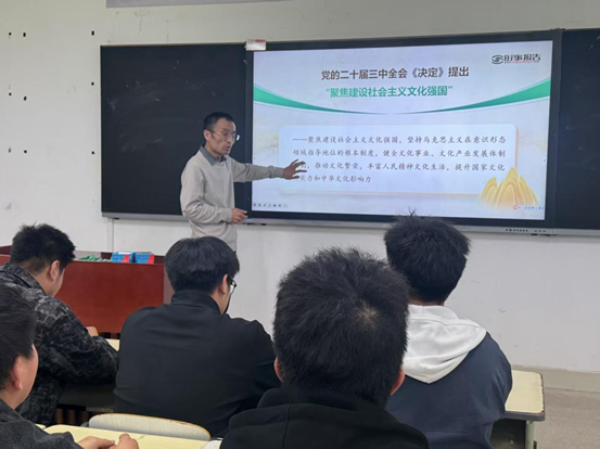 张科强结合党的二十届三中全会精神和习近平总书记关于文化强国建设的重要论述,深入阐释了新时代青年肩负的责任与使命。文化自信是民族复兴的精神支柱,青年作为国家的未来,要深刻理解中华优秀传统文化的时代价值,主动践行社会主义核心价值观,在推动社会主义文化繁荣发展中展现担当。希望机电学子不仅要锤炼过硬的专业技能,更要厚植家国情怀,增强文化自信,以“强国有我”的信念,将工匠精神与创新文化融入实践,在科技创新中传承文化基因,在社会服务中弘扬时代新风。