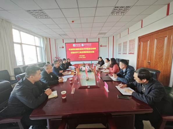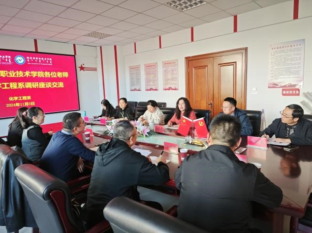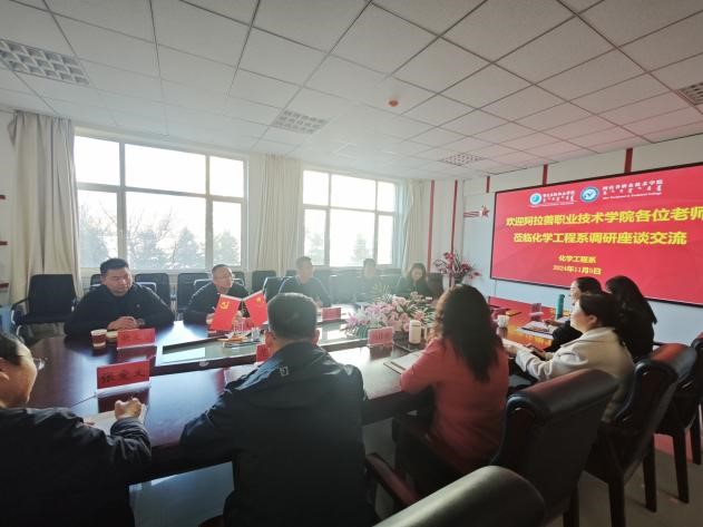 11月5日,阿拉善职业技术学院化工工程系主任黄文庆、教学科长赵彦贵、应用化工教研室主任伞桂艳等一行5人到化学工程系走访调研,化学工程系书记、主任马桂香、副主任钱春苹、教研室中心主任、专业负责人及相关教师参加座谈交流。