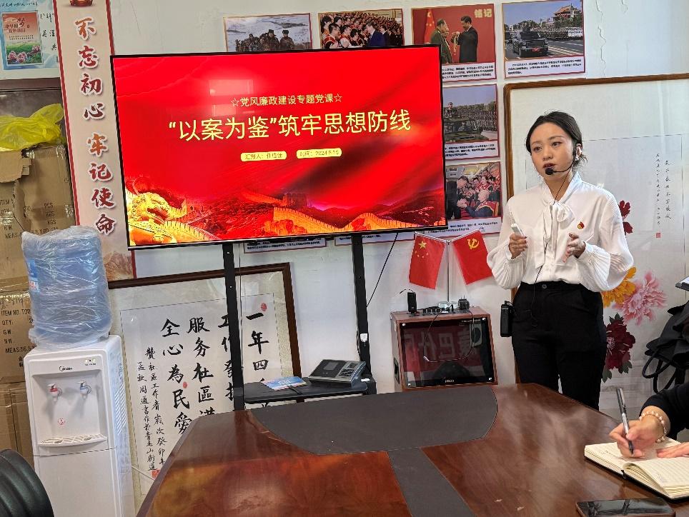 首先邀请学院清风讲堂宣讲成员、思政部教师任佳佳同志为大家讲了一节题为“以案为鉴 筑牢思想方向”专题党课。任佳佳老师从深化反腐倡廉认识、以案为鉴/部分党员干部思想防线存在的主要问题、筑牢思想防线 练好“三功”等三个方面讲述了一堂生动的廉政党课。