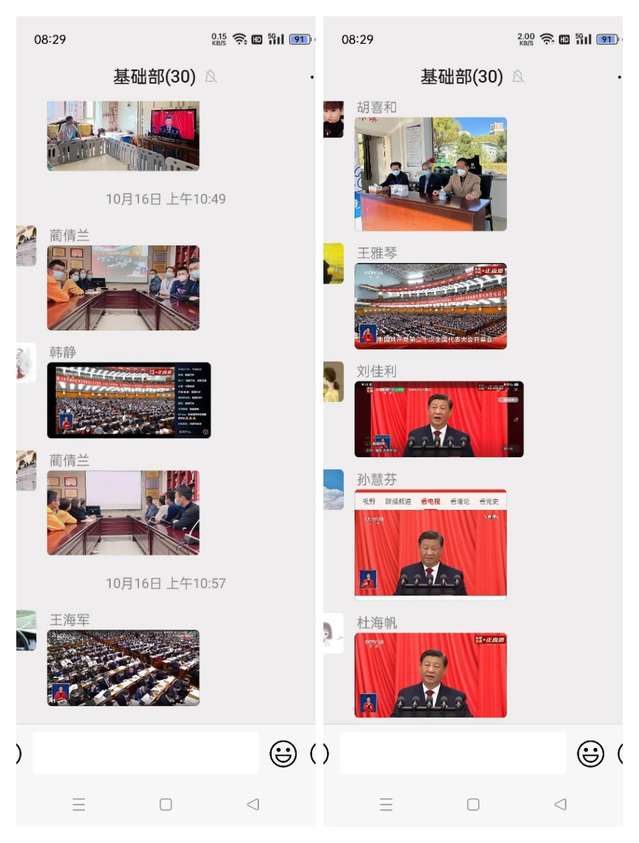聆听完大会报告,基础部全体教师欢欣鼓舞、倍感振奋、反响热烈。在校教师录制视频表达对党的二十大胜利召开表示祝贺。大家纷纷表示,要深入学习党的二十大报告精神,扎扎实实把精神落到实处,不断提高业务能力,为全面建设社会主义现代化国家、全面推进中华民族伟大复兴而团结奋斗。