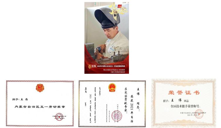 2014-2021年智能焊接专业教师王伟被先后评为全区技术能手”;内蒙古自治区“突出贡献专家”等荣誉称号。