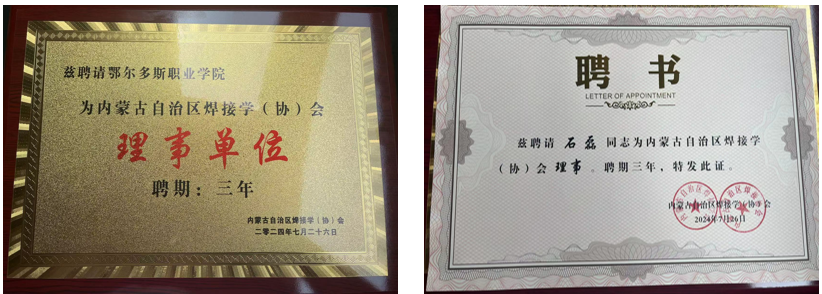 2024年智能焊接专业团队受聘内蒙古自治区焊接学(协)会理事。